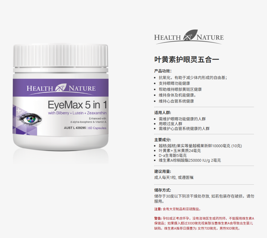 > Health 'N' Nature 叶黄素护眼灵五合一胶囊 60粒