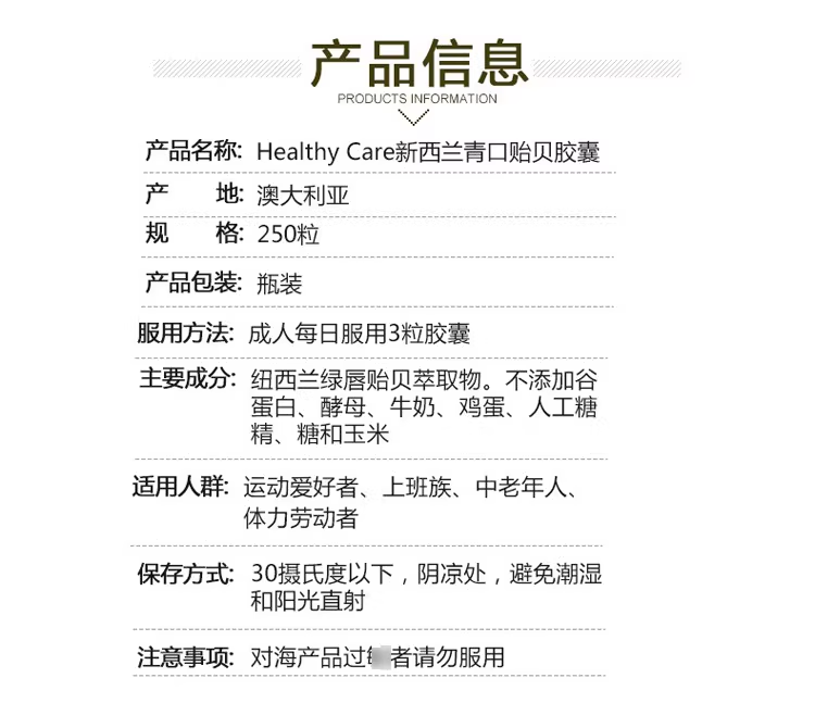 > Healthy Care 新西兰青口贻贝胶囊 250粒