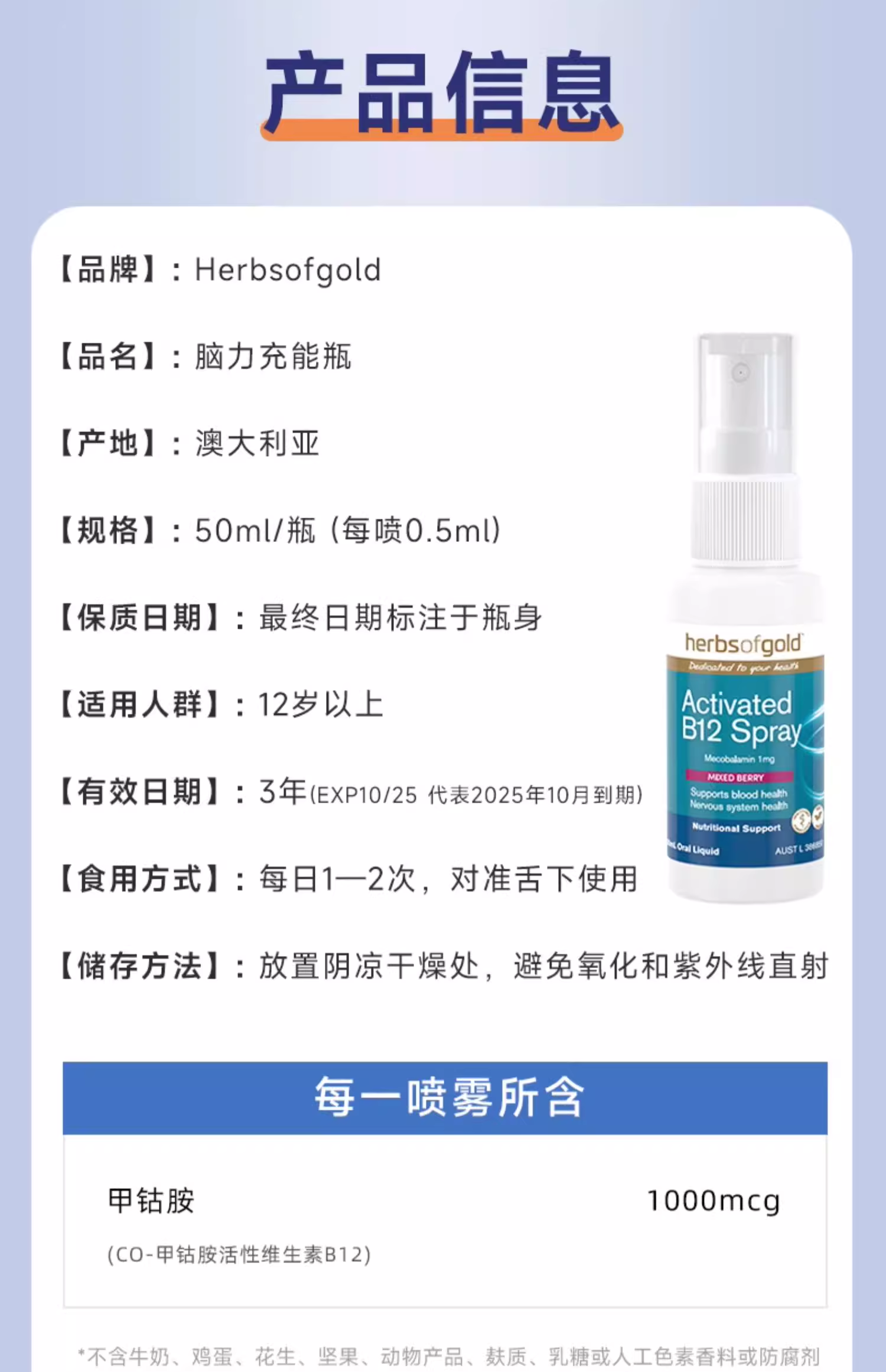 > Herbs of Gold 和丽康 活性维生素 B12 喷剂 50ml