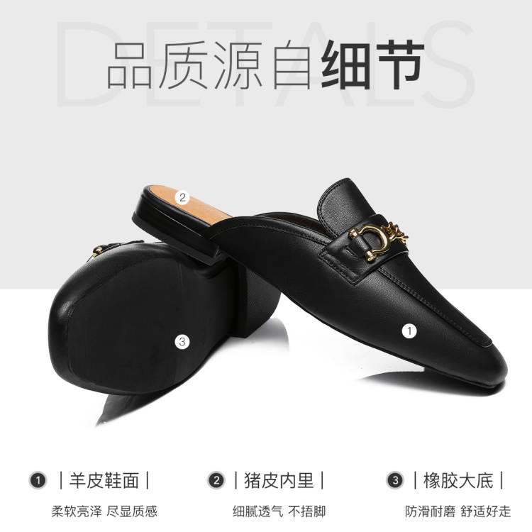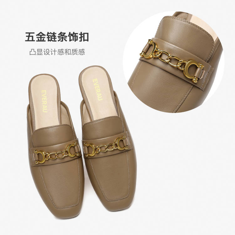 鞋面:羊皮 内里:猪皮 大底:橡胶,产品采用A级羊皮制作而成,鞋面精致独特的五金链条饰扣点缀鞋面凸显鞋子的设计感和质感.搭配精致的裤装裙装以及慵懒的服装风格都可.