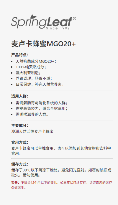 > Spring Leaf 绿芙 麦卢卡蜂蜜MGO20+ 500g