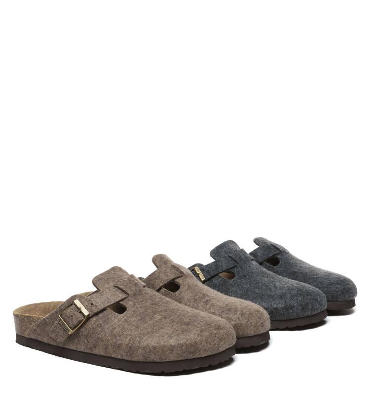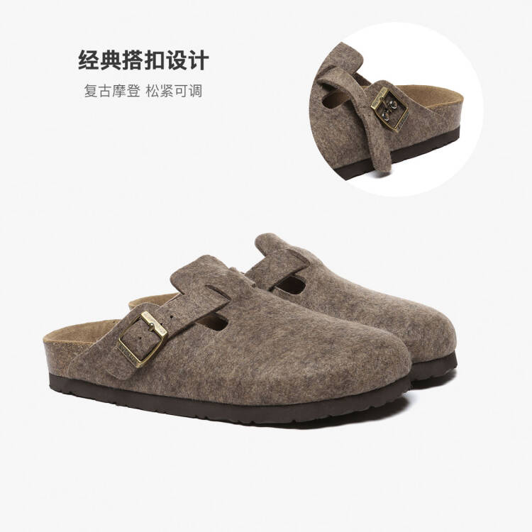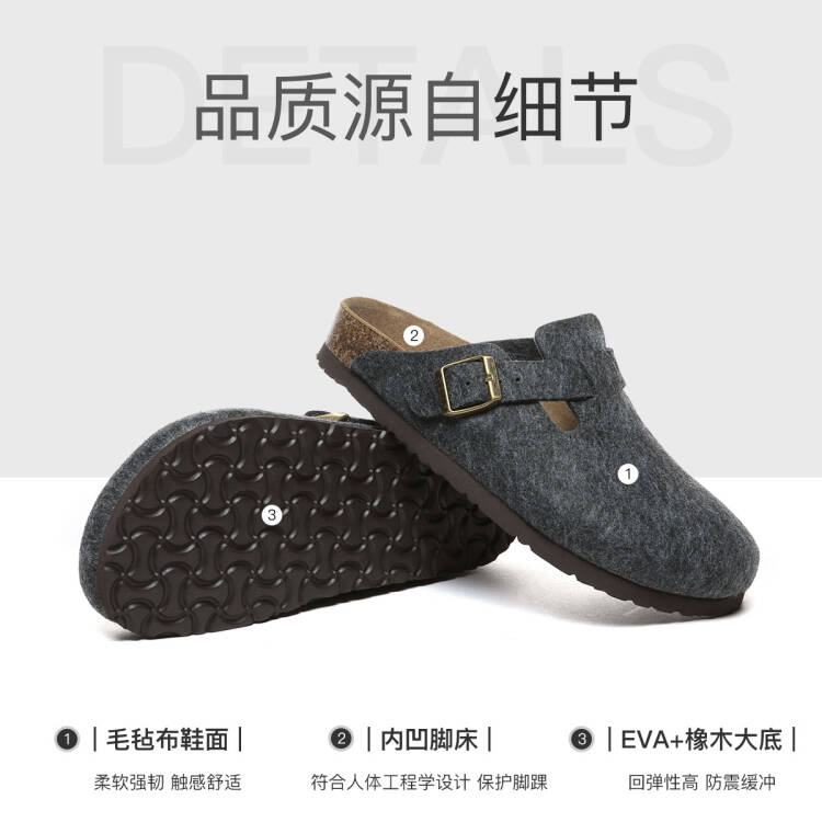 鞋面:毛毡布 内里:毛毡布 垫脚:牛反绒 大底:EVA发泡+PVC橡木 底厚1cm,脚床2.5cm