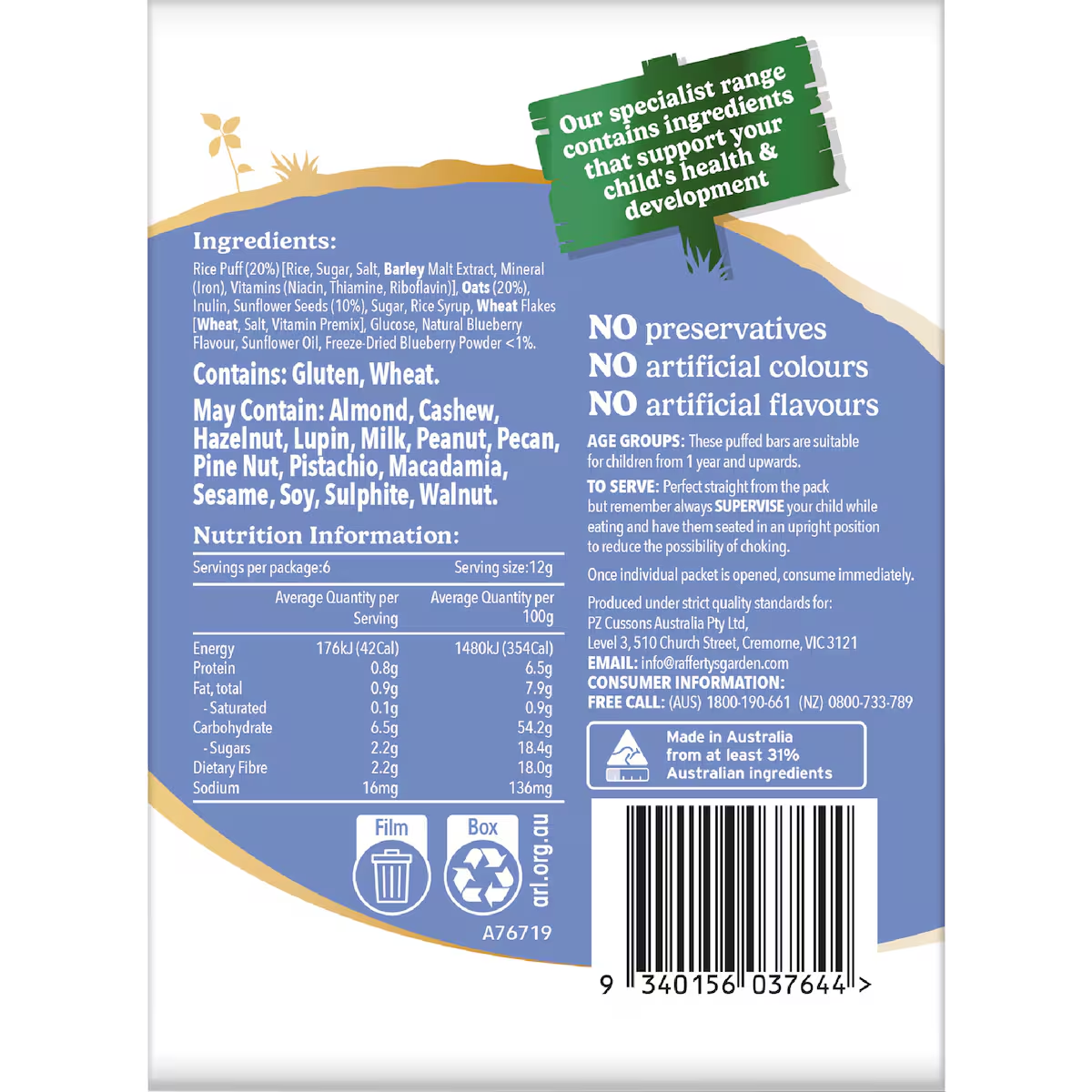 > Rafferty's Garden Happy Tummies 蓝莓膨化米棒 72g (1-5岁)