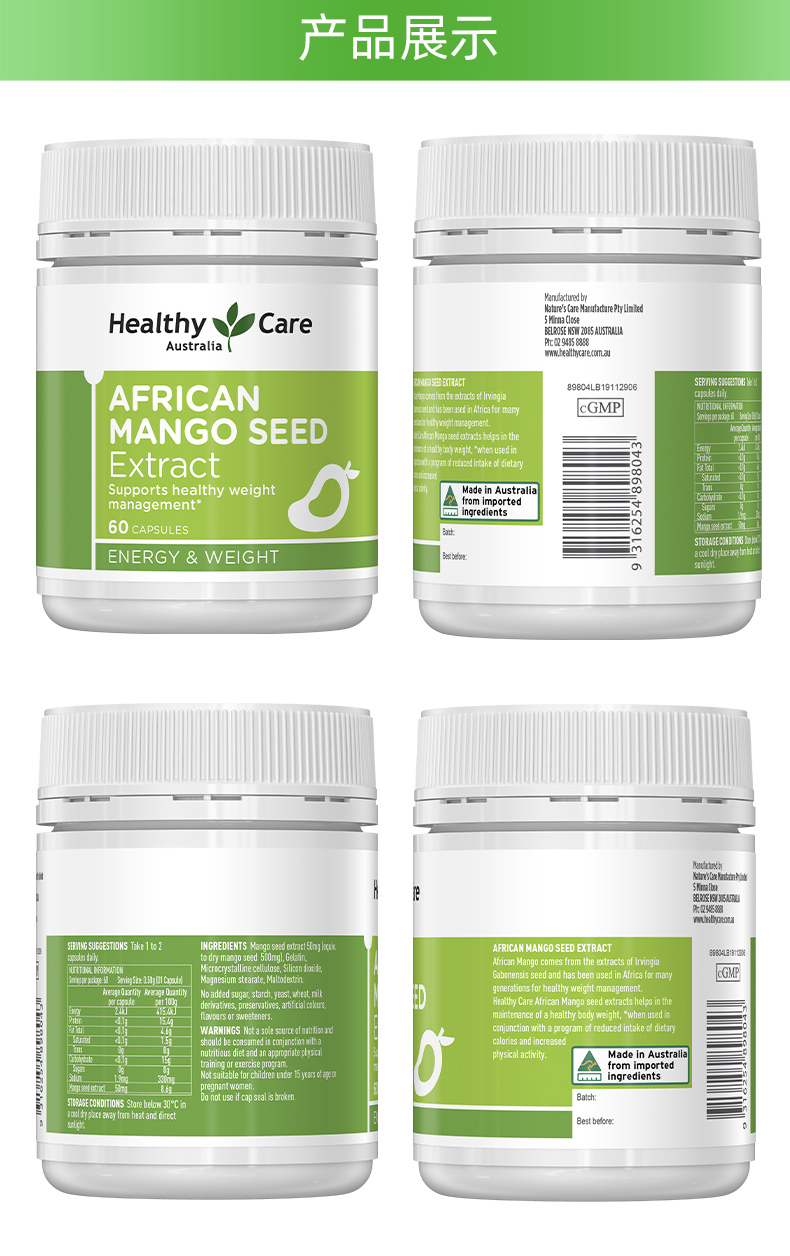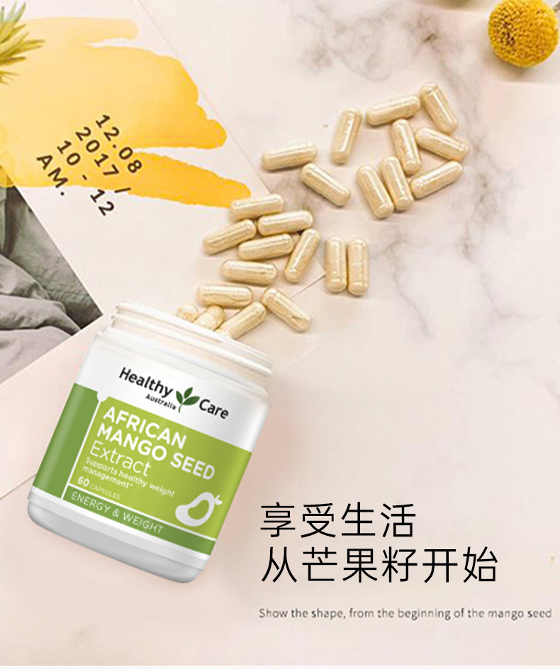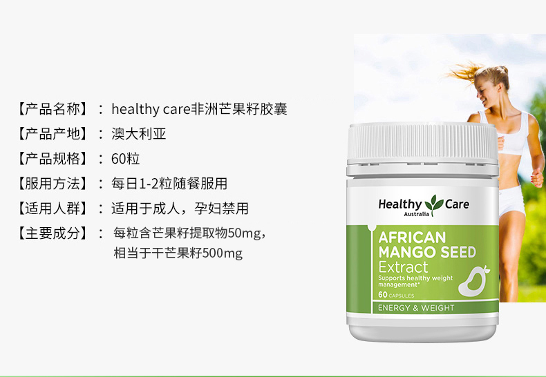 【运输途中高温天气,产品有融化风险,无法售后。建议:附加服务备注加锡纸,走EWE物流】 Healthy Care 瘦身热品纯天然非洲芒果籽精华每个胶囊含有非洲芒果精华,相当于500mg的芒果种子,不含任何的淀粉、酵母、麸质,盐和人工色素,含少量的糖,可以影响新陈代谢,以及免疫系统,并且可以控制食欲,高水平“瘦素”给大脑释放信息,所以你会减少对食物的欲望,从而避免过多的进食。