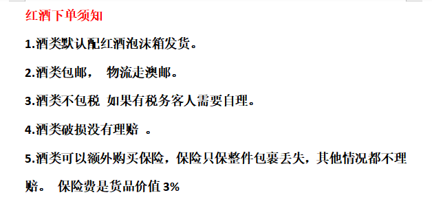 红酒下单须知: 1.酒类默认配红酒泡沫箱发货。 2.酒类包邮, 物流走澳邮。 3.酒类不包税,如果有税务客人需要自理。 4.酒类破损没有理赔 。 5.酒类可以额外购买保险,保险只保整件包裹丢失,其他情况都不理赔。 保险费是货品价值3%
