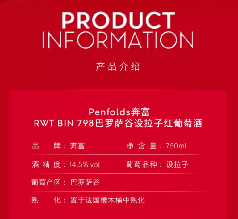 > Penfolds奔富 RWT BIN798干红葡萄酒 750ml