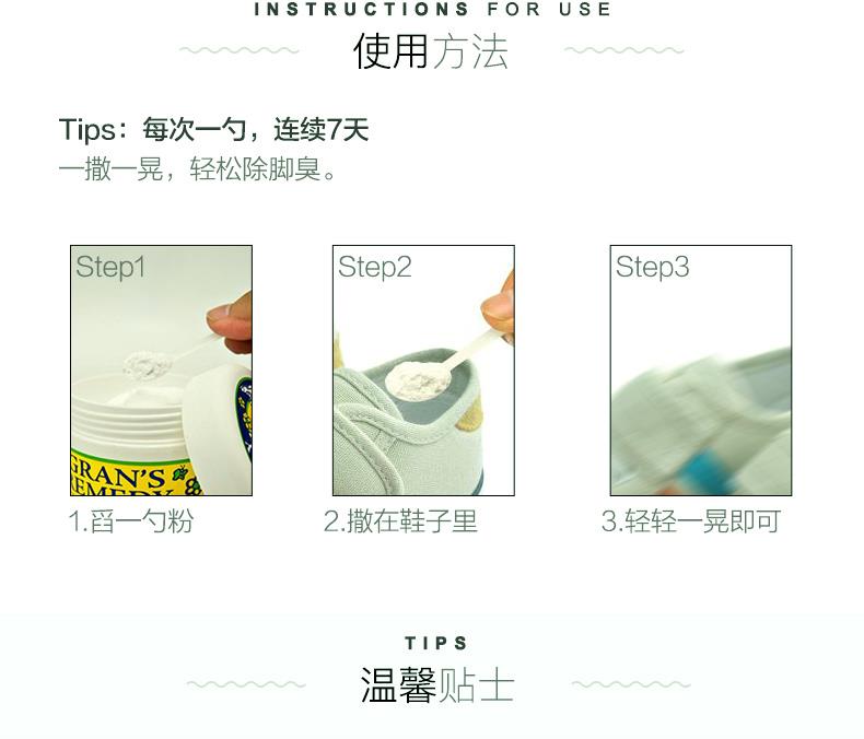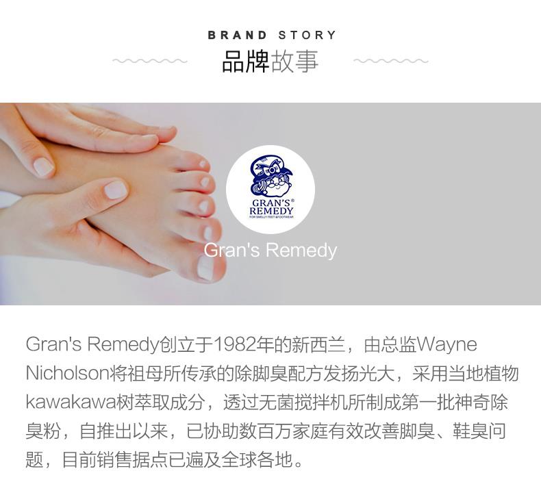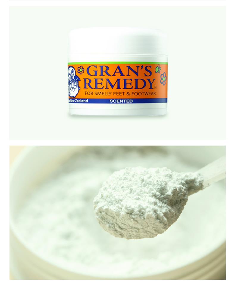 Gran's 老奶奶臭脚粉来自新西兰神秘配方,特有的Kawa Kawa 植物提取,kawakawa是新西兰毛利人的传统药用植物,当地土著毛利人几个世纪以来的传统神奇药用植物,用于消炎杀菌、跌打损伤。去除脚臭、鞋臭,预防脚气反复发作,缓解各种脚气症状,除臭杀菌的效果。有效抑制导致脚臭的5大细菌在鞋内滋生:Trichophyton(发癣菌),Micrococcus(球状细菌),Brevibacterium(短杆菌),Bacillus(枯草芽胞杆菌),Acinetobactium(不动桿菌)