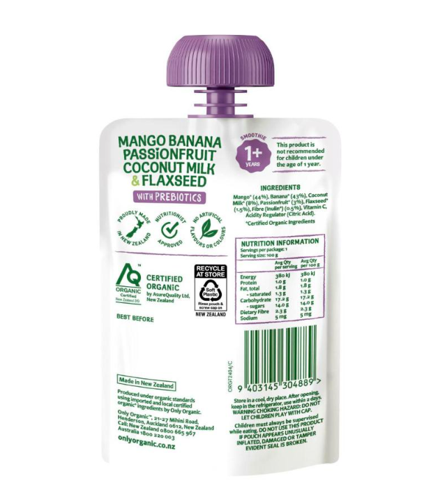 > Only Organic 芒果香蕉百香果椰子亚麻籽果泥(1岁+)100g