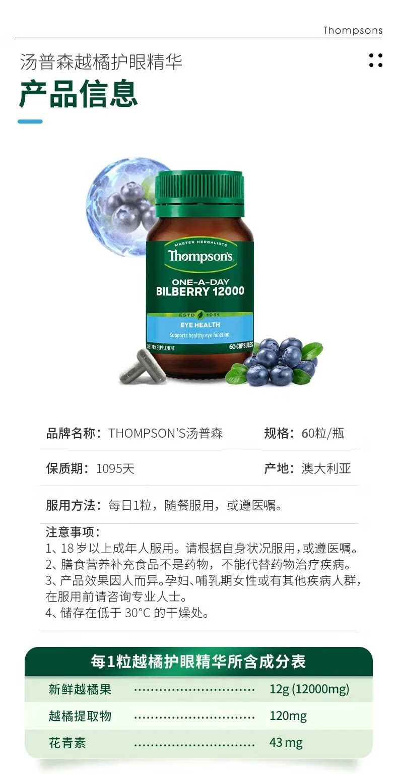 > Thompson's 汤普森 蓝莓越橘护眼精华胶囊 60粒 清晰视界 改善眼部循环