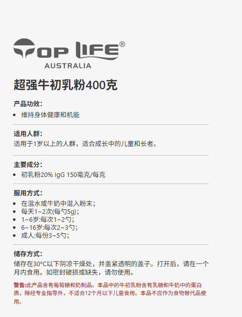 > Top Life 特维康 超强牛初乳粉400g